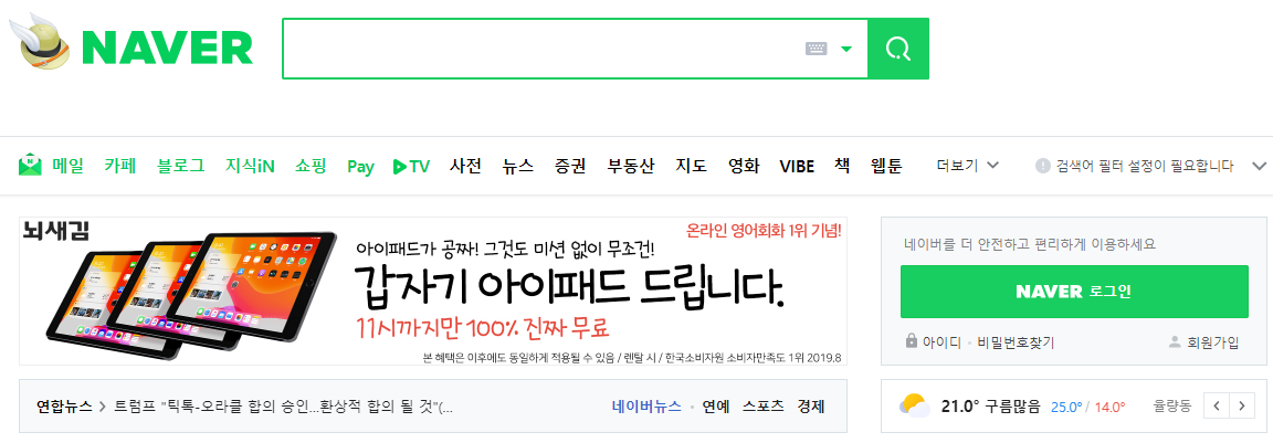 평화로운 토요일 아침. 날씨도 맑고 날도 선선하니 아침공기가 맑았다. 8시쯔음 눈을 떠 기지개를 켜고, 여느때와 같이 모니터 앞에 앉아 네이버를 먼저 실행했다. 그랬더니 갑자기 아이패드를 준다는 광고 배너를 보고, 아직 세수를 하지 못해 침침한 내 눈이 번쩍 떠졌다. 보통은 뭔가의 조건을 달고, 상품등을 준다고 하는데 무려 "뇌새김"이라는 대형 어학원 같은곳에서 조건없이 준다고하니 눈이 떠질 수 밖에 ...